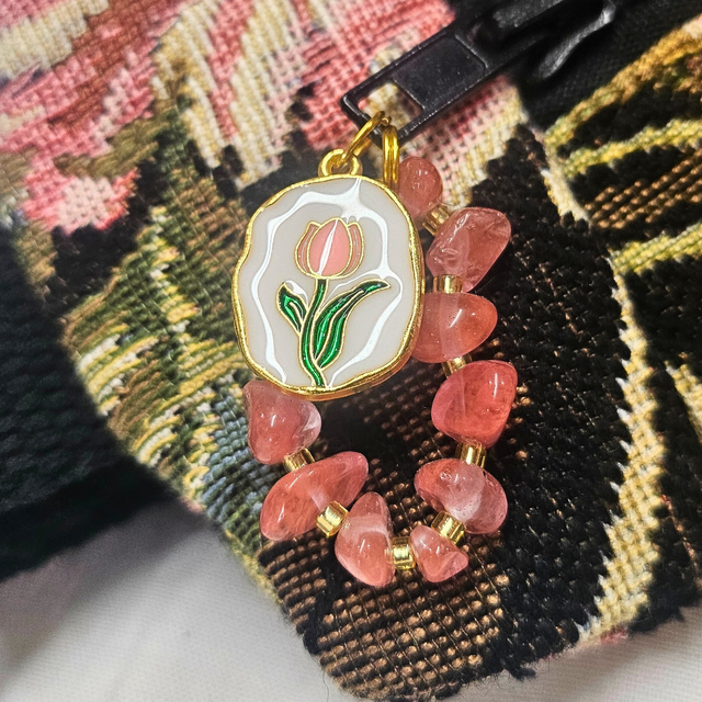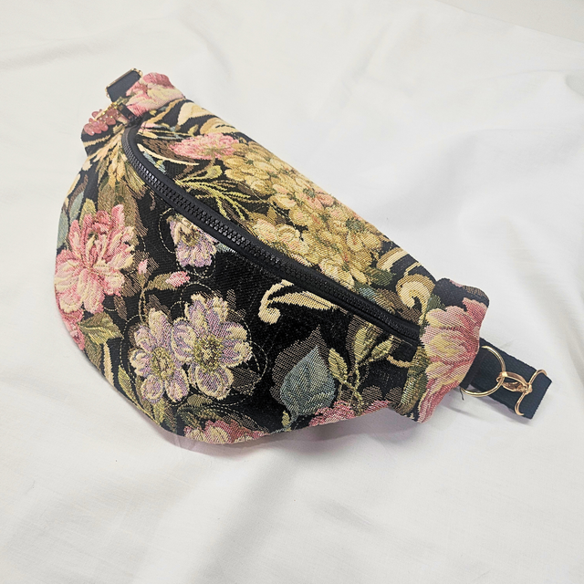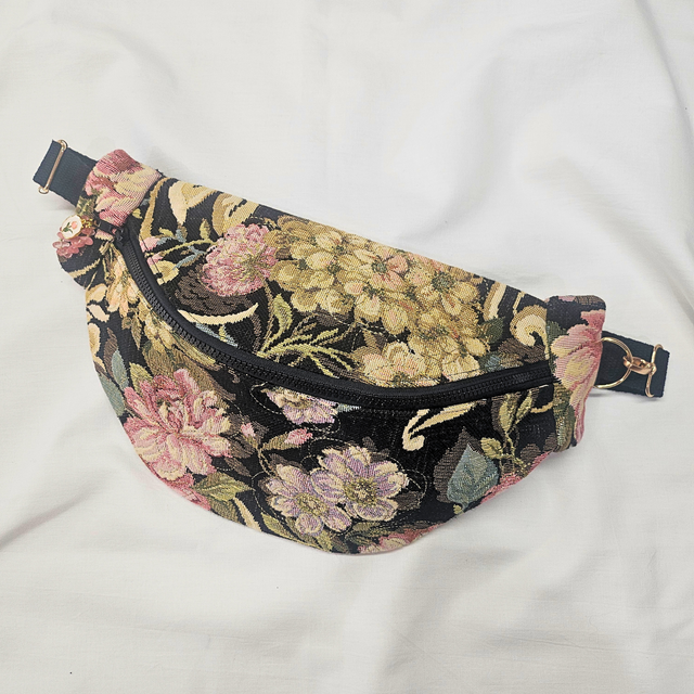 Ce sac banane au style bohème-chic est confectionné à partir d’une tapisserie noire aux motifs floraux, alliant profondeur et délicatesse. De fines broderies dorées rehaussent les fleurs, ajoutant une touche précieuse. Une mini dragonne en perles naturelles rose et perles de rocailles dorées souligne la fermeture éclair, apportant une note féminine. Un petit médaillon fleur en breloque parfaire l’ensemble avec poésie.