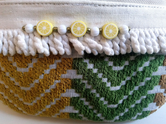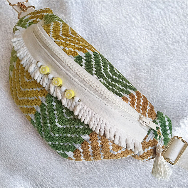 Sac banane en tapisserie vintage aux motifs géométriques, ornée de franges récupérées avec une bordure agrémentée de perles en fimo citron. Le dos est assorti pour une finition harmonieuse. L’intérieur est doublé en coton léger. Sa fermeture éclair blanche est accompagnée d’un pompon blanc cassé. La sangle réglable en coton blanc, avec bouclerie dorée, mesure 1, 20 mètre pour s’adapter à toutes les morphologies.