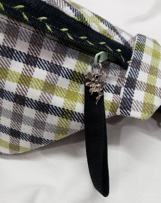 Confectionnée à partir d’un tissu à carreaux composé de laine et de coton, cette banane est agrémentée d’une patte brodée d’une ligne de feuilles, dissimulant une fermeture vert pastel agrémentée d’une dragonne et d’une breloque en forme de fée. Le dos, en jean uni noir, garantit durabilité. L’intérieur est doublé d’un tissu original à motif kiwi. Elle est dotée d’une sangle réglable en jean de 1,20 mètre, conçue pour s’adapter à toutes les morphologies.