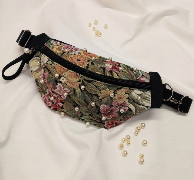 Confectionnée à partir d'une ancienne tapisserie en coton, cette banane arbore un élégant motif floral. Elle est matelassée et agrémentée de perles nacrées. L'intérieur est doublé d'un satin vert foncé. Le dos est en coton noir unis et épais, offrant robustesse et durabilité. Sa fermeture éclair est enrichie d'une dragonne noire et d'une breloque de perle. Elle est accompagnée d’une sangle réglable en coton de 1,20 mètre, pour s’adapter à toutes les morphologies.