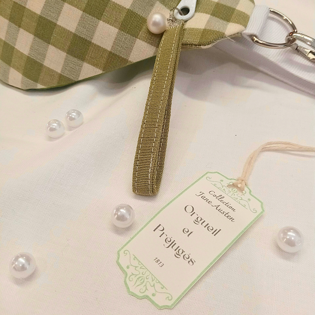 Réalisé en coton, il arbore un motif vichy vert et blanc crème délicat, un camée brodé et des perles nacrées. Doublé en satin blanc, il est orné d’une breloque assortie. Sa sangle et sa dragonne en coton assurent un confort optimal. Et qui sait ? Avec un tel charme, vous pourriez bien faire craquer votre propre Monsieur Darcy !