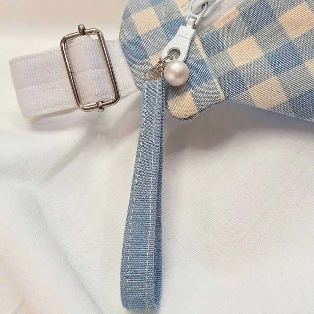 Réalisé en coton, il arbore un motif vichy bleu et blanc crème délicat, un camée brodé et des perles nacrées. Doublé en satin blanc, il est orné d’une breloque assortie. Sa sangle et sa dragonne en coton assurent un confort optimal. Son style intemporel et raffiné apportera une touche d’élégance à toutes vos tenues ! Et qui sait ? Peut-être que ce sac vous aidera à trouver l’équilibre parfait entre raison et sentiments… ou à séduire votre propre Colonel Brandon !